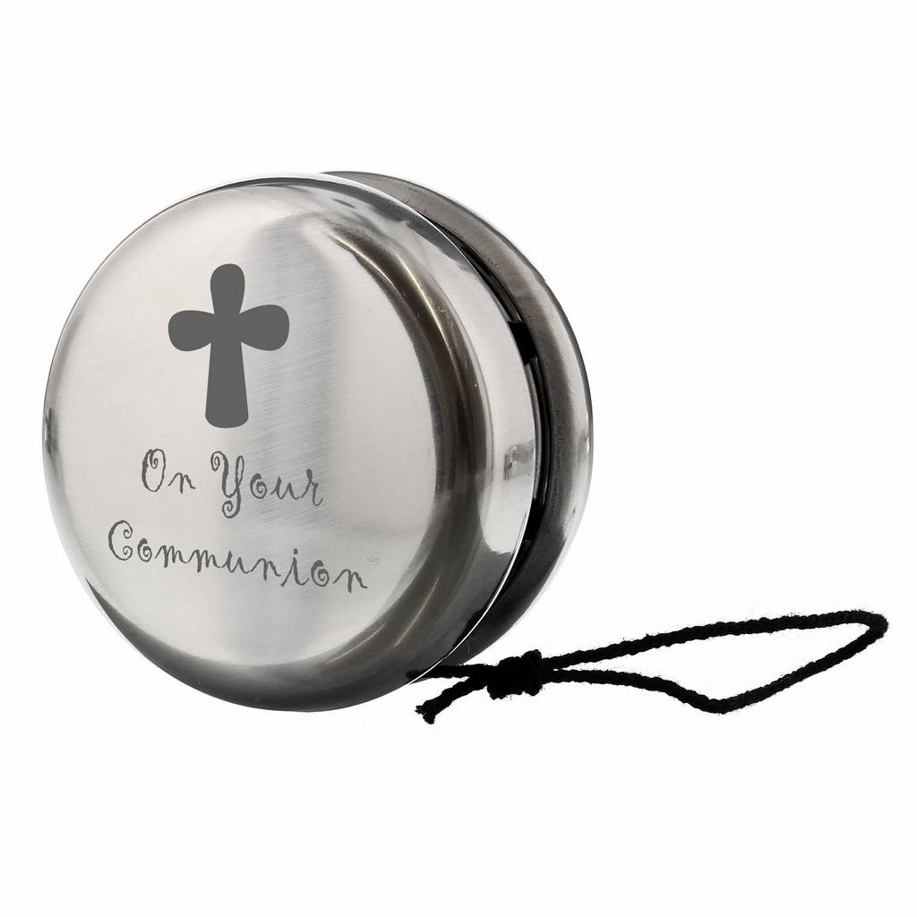 This On Your Communion YoYo features a cross motif and the wording ‘On Your Communion’ is standard text.