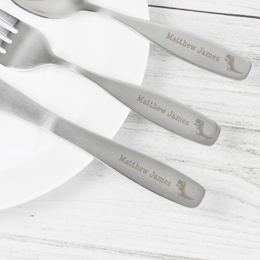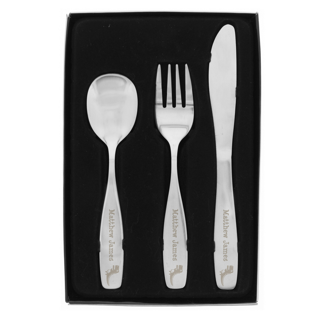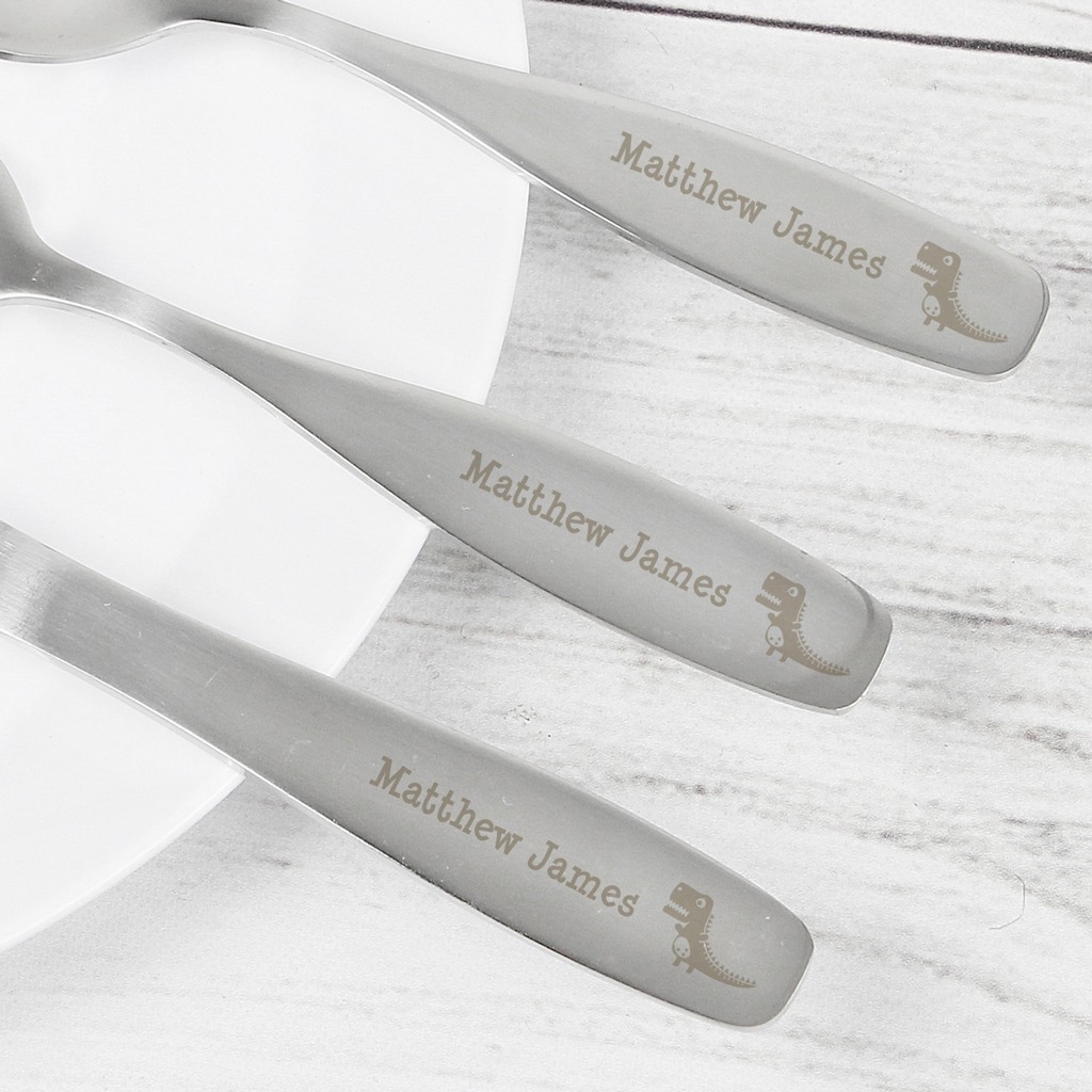 Personalised 3 Piece Dinosaur Cutlery Set With 1 Gift Customisation Field And Express Delivery Options .