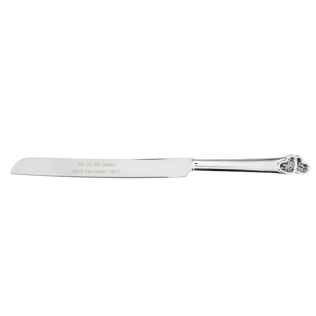 Personalise this silver plated Classic Cake Knife with any message over 2 lines and up to 30 characters per line. Personalisation is engraved on the blade of the knife handle.