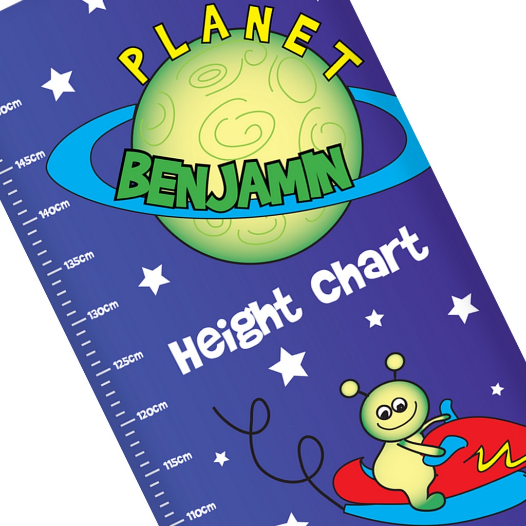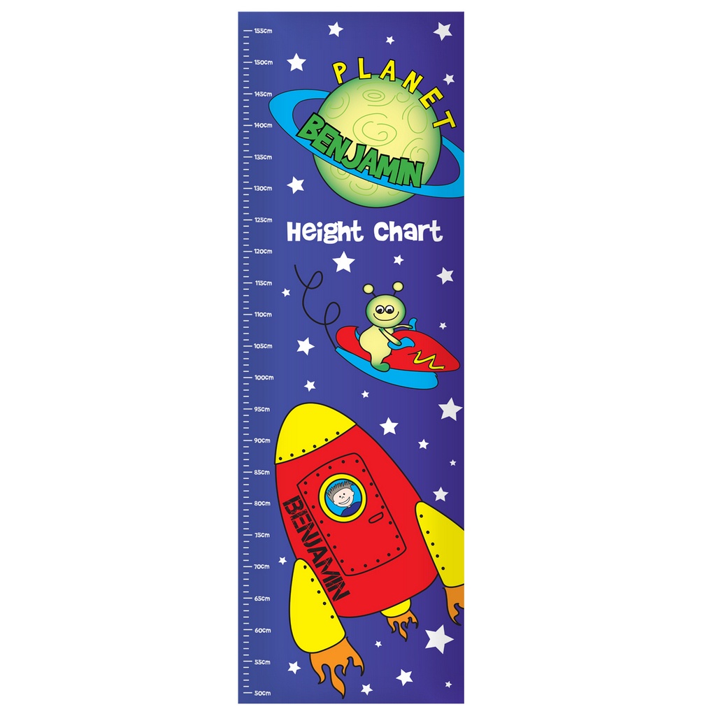 Personalise this Space Height Chart with a name using up to 12 characters and small message using up to 15 characters (for example, ‘Height Chart’ ‘Happy Birthday’ ‘Growing fast’ ‘Love Mum and Dad’).